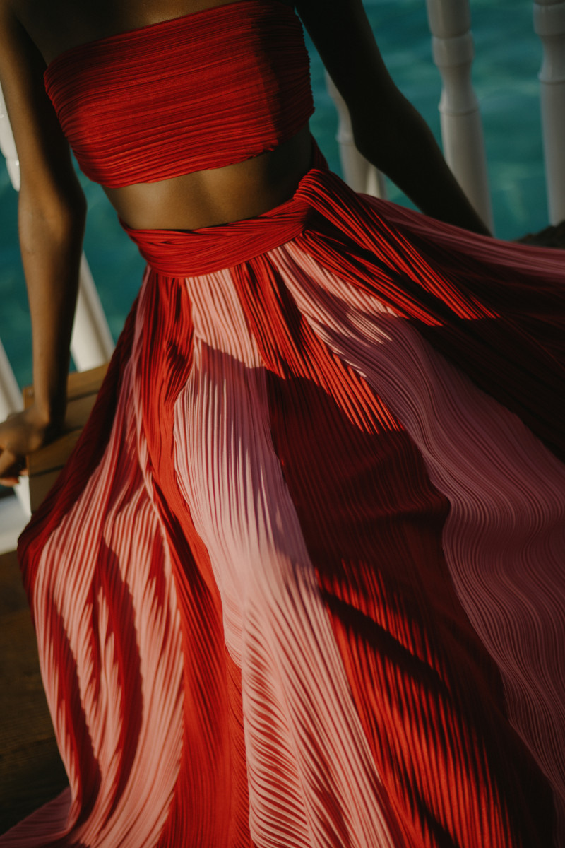 Cada entrega en su marca es una continuación de la anterior. “Es una búsqueda. Lo empecé a hacer con el larimar y el ámbar, cuando incluía hebillas incrustadas. Ahora, con Piedra profundizo más”. El crepé, una tela que marcó el inicio de su carrera, regresa en una versión reinterpretada. Se mezcla con su ya reconocible plisé, que permite piezas versátiles, armadas o anudadas, diseñadas para un cuerpo en movimiento.