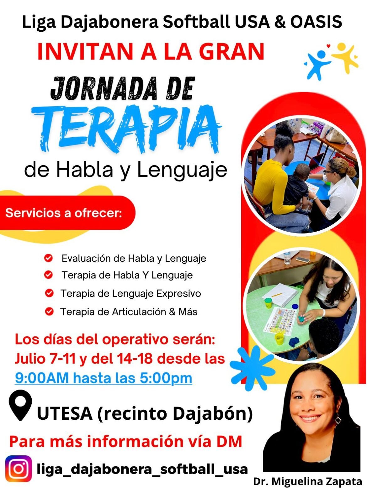 La jornada es dirigida por la especialista Dra. Miguelina Zapata, quien cuenta con amplia experiencia en el área de terapia del lenguaje, y quien estará supervisando personalmente cada caso con un enfoque profesional y humano.