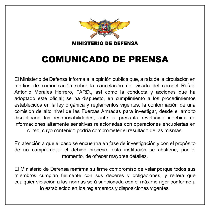 A través de un comunicado, el Ministerio de Defensa de República Dominicana (MIDE) informó que investigará la presunta revelación indebida de informaciones relacionadas con operaciones encubiertas que expuso el coronel Rafael Antonio Morales Herrero.