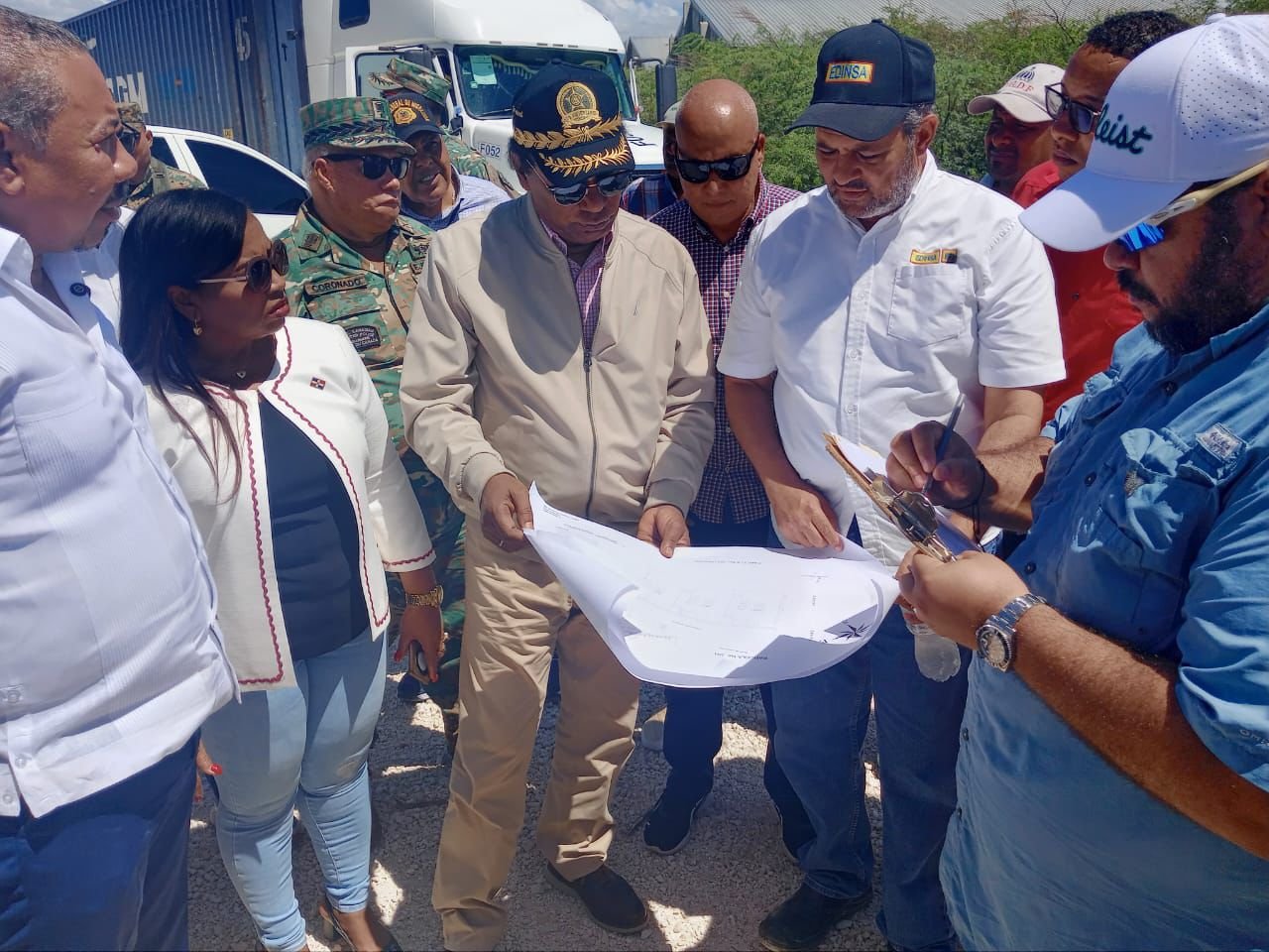 En Pedernales, el recorrido abarcó el mercado binacional cuya construcción está a cargo del ingeniero Iven Segura, acompañado del general Coronado, supervisor del muro fronterizo; la gobernadora Edilda de Oleo; el alcalde municipal Alfredo Francés; y el coronel Morlin Fabián Florentino, director de Cesfront.