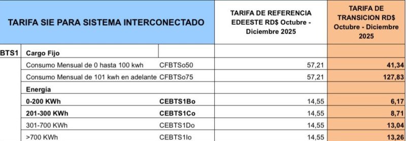 Sin embargo, la tarifa de transición, que es el precio que se factura al cliente residencial (BTS1), es significativamente menor. Para el rango de consumo social equivalente de 0 a 200 kWh, el usuario solo paga RD$6.17 por kWh. Esta diferencia implica que el Estado está absorbiendo RD$8.38 por cada kWh consumido en ese tramo, cubriendo más del 57% del costo total para proteger a los hogares de menor consumo.