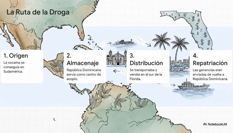 Los narcotraficantes fueron acusados por los Estados Unidos de conseguir cocaína en Suramérica, desde donde la transportaban a República Dominicana que les servía como punto de almacenamiento. Luego era trasladada al sur de la Florida, en los Estados Unidos.