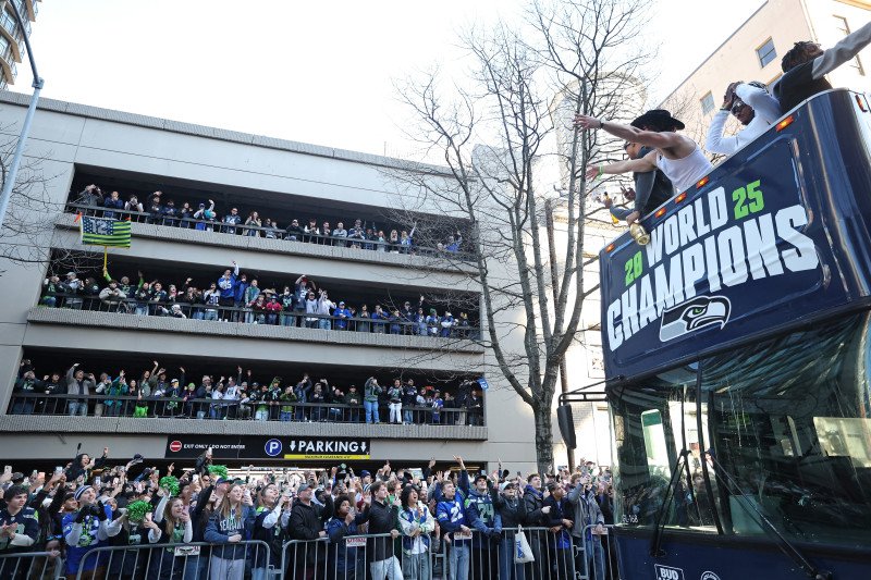 Los aficionados se congregaron primero en la cancha de los Seahawks, el Lumen Field, para la ceremonia de entrega del trofeo conquistado el domingo, con un inapelable triunfo 29-13 sobre los New England Patriots.