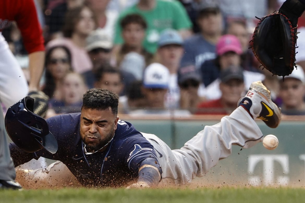 Justin Meadows empató el partido con un jonrón de terreno en la novena entrada, el dominicano Nelson Cruz consiguió la ventaja con un sencillo en la décima y los Rays de Tamba Bay remontaron seis anotaciones para imponerse el lunes 11-10 a los Medias Rojas de Boston.