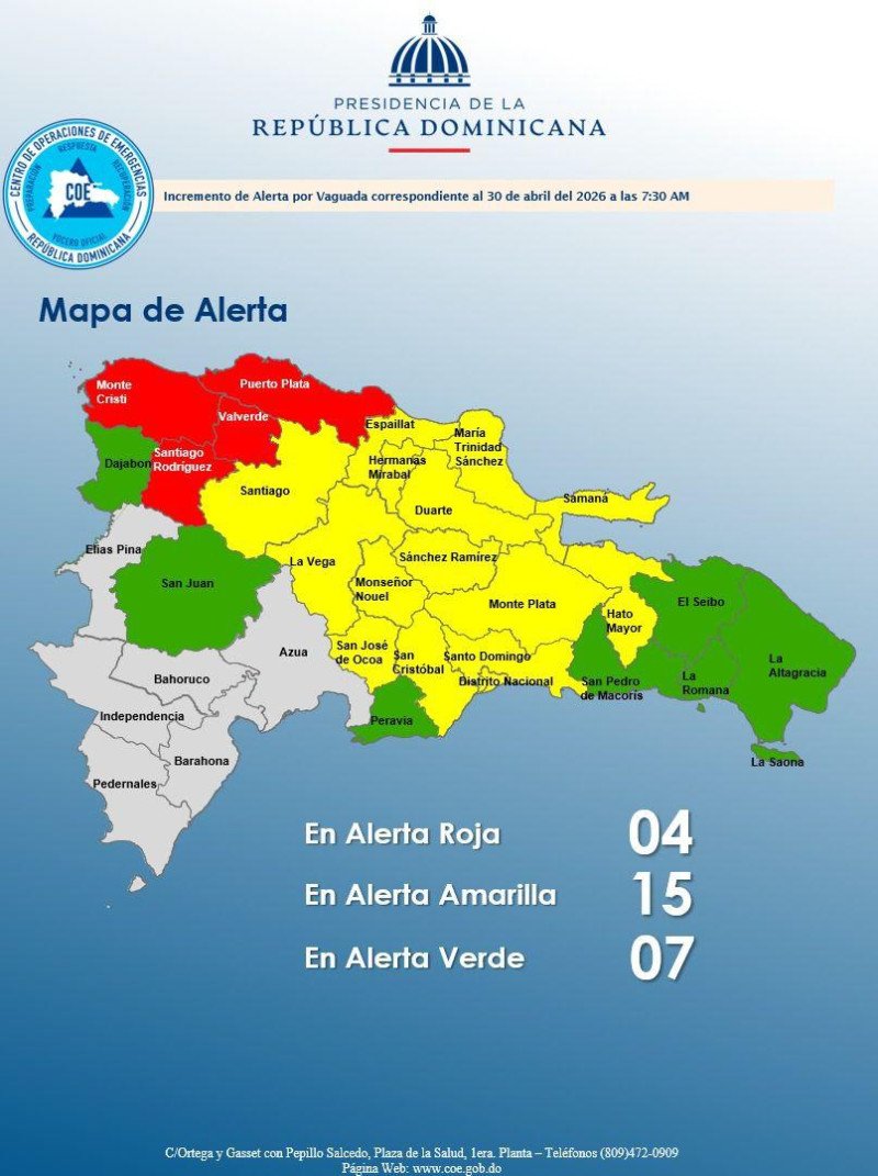Las provincias en alerta roja son: Monte Cristi, Valverde, Santiago Rodríguez y Puerto Plata.
