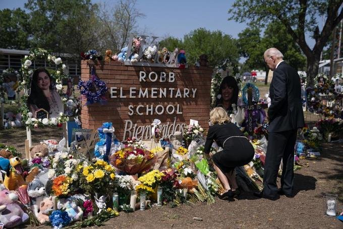 Acompañado por su esposa, Jill, el mandatario visitó las 21 cruces instaladas frente a la fachada de la escuela primaria Robb en memoria de los 19 niños y dos maestras asesinados el martes pasado en un aula, y luego asistió a una misa en una iglesia católica y bilingüe.