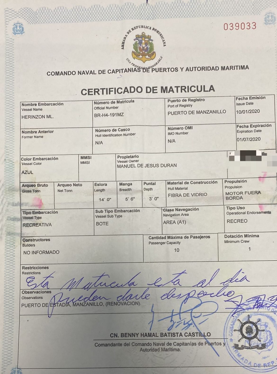 Por este medio hacemos de público conocimiento que en el mes de Mayo en el trayecto Copey-Manzanillo, al señor Manuel de Jesús Durán se le extravió la matrícula BR-H4-191MZ, perteneciente a