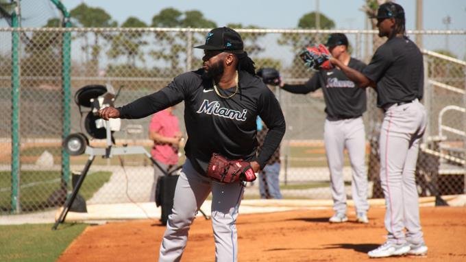 El lunes por la mañana, el dominicano soltó el brazo con sus compatriotas Sandy Alcántara y Edward Cabrera. El martes, Cueto y Cabrera hicieron pareja antes de realizar una sesión del bullpen.